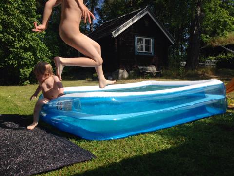 Resan hem från Skåne gick över förväntan. Många timmar i bil passerade så gott för bägge barnen. Hemma, via kaffestopp hos mamma – och pusskalas med hundarna. Skönt att komma hem. Nu – varma, soliga dagar. Utan plan, bara koppla av. Nya morgonrutiner, frukost i svalkan på altanen. Läsa DN. Vår lilla pool blåstes upp efter frukosten i morse och glädjen blev total i hettan för Maria och Olle! Fredrik spelar golf med kompisar och ikväll ska vi grilla!