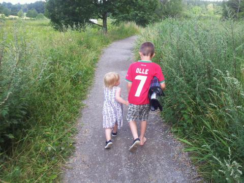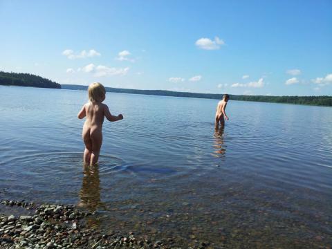 Idag skulle Mamma in till stan och jobba så vi klurade vid frukost på vad vi skulle göra i hennes frånvaro. Vara inne på Lek & Bus kändes för svettigt, så efter en stund kom vi på att vi skulle åka och bada vid Steninge-badet. Vi är ingen direkt strandfamilj så lite ovant kändes det. Vi tog bilen ner och sedan en ganska lång promenad genom skogen innan vi kom ner till stranden. Det var så där lagom blåsigt så solen inte stekte. Både Olle och Maria blev mer förtjusta än vad jag trodde. De kunde inte få nog av vattnet och det doppades och kastades sten om vartannat. Till slut fick jag locka upp dem med bullar och saft. Innan vi åkte hem blev det en vända till i vattnet och vi sade alla tre att detta ska vi göra igen, snart! Innan Mamma kom hem hann vi med en lunch, Marias middagslur och en lång cykeltur för att köpa lite glack (glass) på Marias order. En toppendag som gärna får gå i repris.