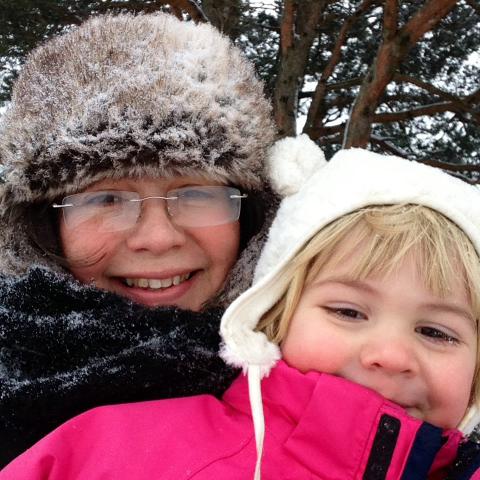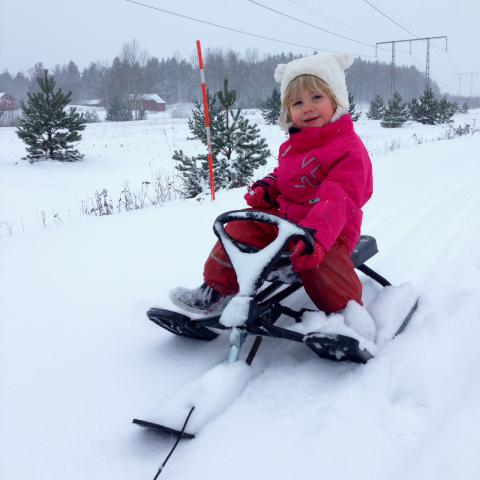 Idag är dagis stängt. Imorse låg jag och Maria och sov lite till när Fredrik och Olle åkte iväg till skola och jobb. Efter frukost pälsade vi på oss rejält, dags för liten snöutflykt! Jag drog Maria på snowracer, det var djup snö och jag pulsade rejält fram.. efter ett tag stannade vi till under några träd i lä för snövinden, och Maria fick lite mintchoklad. Det är viktigt med proviant också!