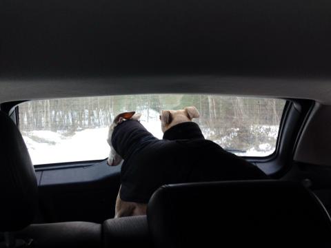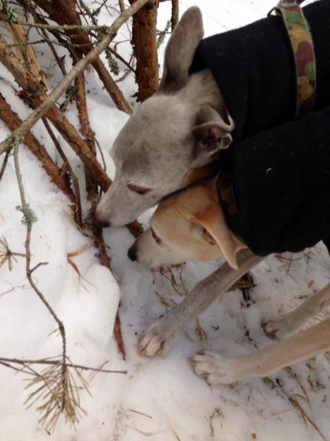 Dagen förflöt. Timmarna blev till till klockan tre. Dags att hämta barnen snart, men innan det skulle vi ut på en liten mikropromenad till. Jag tog mod och lastade in hundarna i bilen. Jag körde så försiktigt, bromsade in sakta sakta inför svängar. Alltid blicken i backspegeln. Tuscan stod upp. Han fick absolut inte ramla. Aston hjälpte honom med balansen då och då. Jag blev återigen så rörd. Hur många hundratals, eller kanske tusentals gånger har jag inte kört med mina glada och förväntansfulla grabbar så här? Och så även idag! Jag körde upp till vår lilla plats i skogen som jag kallar för ”Gotlandsvägen”. Ett väldigt inofficiellt namn, men om sommaren påminner en speciell stig där mig om Gotland. Den ön har ju hundarna också besökt med oss för övrigt..! Jag släppte ned Tuscan när vi kom fram. Aj, det var halt och isigt. Jag började undra, vad gör jag här, stackars Tuscan. Men vi tog det lugnt. Och om det är något sinne som tyckts ha ökat i kraft i Tuscan nu, så är det doftsinnet. Synen och hörseln har väl blivit lite sämre, kroppen är skröppligare och trött – men doftsinnet! Här arbetas det för fullt. Ibland när det är jobbigt att stå och vingla i snödrivor, lägger sig Tuscan sonika ned i snön. Nosen djupt nere i intressanta dofter. Benen spretar åt alla håll, vad spelar det för roll, här är det full koncentration. Vi gick ett litet varv i skogen. På sina håll fanns det barmarker, och där också nya dofter. Sen åkte jag och hämtade Olle och sen Maria. Hela tiden tittade jag då och då i backspegeln. Nu är de två, mina älskade hundar. Nu. Är. De. Två. Ännu en liten tid är det så! Åå jag älskar dom så mycket!