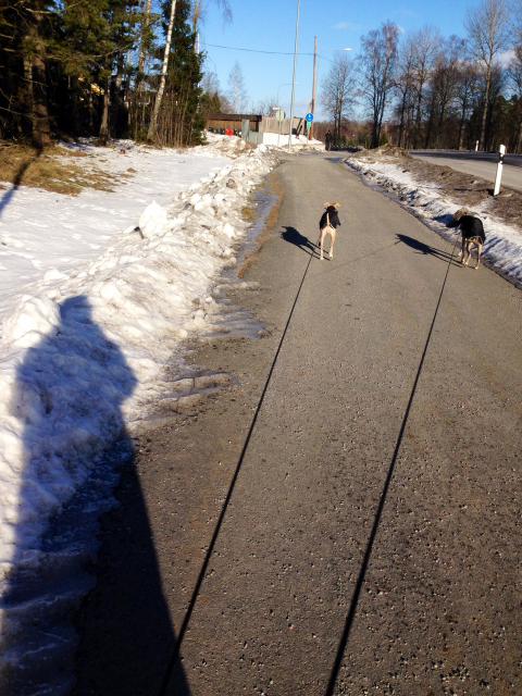 Är ledig idag. Efter barnen åkt med Fredrik till skola och dagis var jag själv med hundarna. De fick mat. Tuscan får nu äta allt han vill! Jag bjöd på köttbullar och det ville han ha många! Aston åt också bra, om än sin vanliga meny. Hundarna la sig för att vila litet. Det var tyst i huset. Solen sken ute. Jag började städa på nedervåningen. Ville göra något fysiskt. Göra något fint. Sortera och rensa. Jag gav mig an stora leksakskorgen, till fullo proppad med gamla gosedjur, pusselbitar och andra prylar. Jag vände den upp och ned, innehållet upptog till ytan halva hallgolvet. Jag rensade olika högar, en del spara och upp till barnens rum. Andra slänga, och en del lite fina bebissaker, satte jag i påsar med band runt, de skulle jag lämna till second hand-affären. Det blev fint, rent, tydligt. När jag ändå höll på gick jag ut och tog allt skräp som skulle till sopstationen som övervintrat ute i skjulet. Till slut var hela farstutrappan full av grejjer. Jag lastade i bilen, det fick precis plats för en förare, sen var det proppat! Jag gick sen ut med hundarna. Det är en procedur nu med promenader, eller mikropromenader rättare sagt, nu denna sista tid för Tuscan. Han är så ostadig i benen. Jag får ta på hans täcke när han står under matta, eller hjälpa med balansen. Men han vill ut. Svansen viftar, om än något försiktigt. Aston vimsar fram och tillbaka, ”Ska vi gå nu? JA! Ska vi gå nuuu?” Jag lyfter Tuscan ned på backen, trappor är ju helt otänkbart för honom nu. När jag släppte ned honom såg jag riktigt hur han trivdes i solen, i friska luften. Kroppen haltade och det gick vingligt. Men ändå – starkt fram! Vilket tempo! Jag log och tänkte, vilken fighter han är! Min älskade Tuscan! Snart 14 år gammal – ont i kroppen som inte längre fungerar som den gjort, men Tuscan ger sig inte. Här ska det gå framåt i stark trav ändå. Jag gick på vår lilla väg mot brevlådan, och kände hur ett leende bara växte hos mig. Här går jag. Med mina två älskade hundar. Och vilken fart de har! Så härligt att få njuta en liten stund, här och nu! En liten lycka!