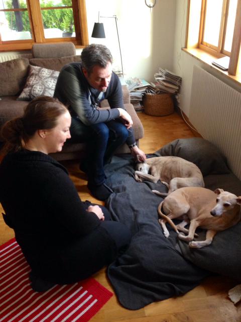 Minuterna innan veterinären kommer känns nervösa. Jag går mellan hundbädden och ger klappar och pussar hela tiden, sedan går jag till fönstret och ser, är hon på väg? Klockan 9.01 skickar hon sms att hon snart är framme. Så säger Fredrik, ”Nu kommer hon..” och bilen rullar in. Fler tårar. Jag måste hålla mig samman, så jag kan presentera mig, tänker jag. Det är en glad och alldeles underbar människa som kommer in i hallen. Aston springer upp för att möta, det utdelas Astonpussar och svansen viftas livligt. Vi berättar lite om vem Aston är, och Eva som veterinären heter, blir glad över mottagandet. När vi så går in i köket händer något som förbluffar mig och Fredrik. Tuscan, reser sig upp – helt själv, viftar på svansen, tar steg framåt, för att själv gå och möta henne – i fullständig glädje! Han och Aston är nästan uppe i hennes famn bägge två, pussas och svansarna viftas. Tuscan som knappt kan resa sig i hundbädden – ja den senaste veckan, kommer han helt enkelt inte upp ibland utan min hjälp, tar nu sina sista krafter för att dels resa sig upp – själv – och sedan ta kliv framåt, och detta i ganska samlad aktion. Hur är det möjligt? Jag och Fredrik har ögon stora som tefat. Tuscan fullkomligt utstrålande lycka, ”Åh, hon kommer nu..!” Han visste. Det är dags nu! Jag och Fredrik blev så rörda.