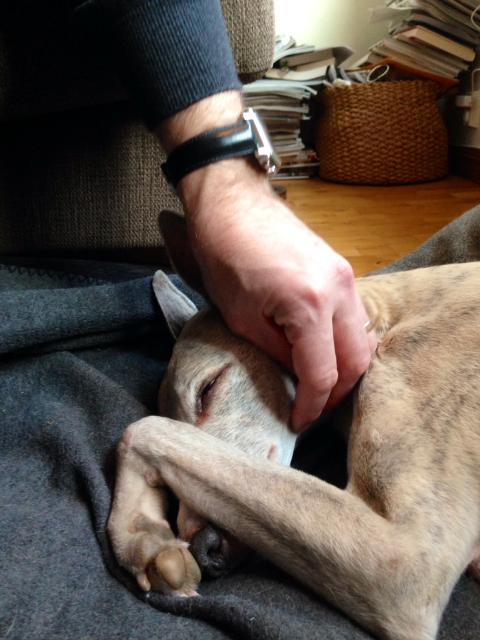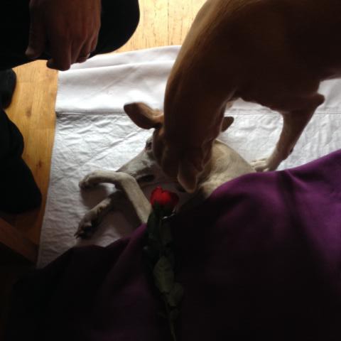 Vi gick igenom papper, hon berättade hur allt går till väga. Vilken ljuvlig ängel hon var, som kom med sitt lugn och trygga expertis, och hjälpte oss hela vägen. Vi satte oss vid hundbädden. Tog tid på oss. Pratade. Kramade Tuscan och Aston. Tårar kom. Så satte hon in bedövningssprutan först. Tuscans andhämtning blev ännu lugnare. Han låg precis som om han bara sov, vilket han ju gjorde. Sen pratade vi lite till, och slutligen förberedde hon sig för själva avlivningssprutan. ”Är ni beredda nu?” frågade Eva. ”Det kommer gå ganska snabbt när vi väl satt in sprutan..” Jag och Fredrik tittade på varandra. Jo, det var vi. Vi grät både Fredrik och jag. Tårar droppade på hundfällen, dom droppade på Tuscan, vi snöt oss i papper. Vi klappade och var så nära, vi pussade hans päls. Viskade fina ord. Vi var så nära. Han var så stilla. Där och då, vi hade sån närvaro, vi kramades och klappade, pussade. Till slut andas inte Tuscan mer. Stilla. Tuscan har nu lämnat kroppen, och säkert klivit in på andra sidan, där kanske pappa välkomnar honom på den där gröna ängen. När Fredrik och Eva lyfter över Tuscans fina kropp till det vita lakanet, vaknar Aston till. Han har vilat så gott genom processen. När Eva lägger på den lila filten över Tuscans kropp vill Aston komma. Han som ju älskar att sova under filt. Så börjar Aston nosa. ”Vad har hänt?” tycktes han undra. Han nosade och pussade Tuscan på nosen, i mungipan och ögonen, i öronen. Han pussade och nosade. Det tog någon minut. Tuscan fick en stor röd vacker ros med sig. Det såg ut som om han sov. Så fridfullt. Sen lyfte Eva och Fredrik Tuscan upp och in i bilen som väntade. Eva la honom så fint. Han fick en liten vit kudde under huvudet. Det lila täcket på. Aston och jag följde efter. Det kändes viktigt att Aston skulle se. Bilen körde iväg. Vi stängde dörren. Älskade Tuscan, jag saknar dig redan! Jag kände stor tomhet och tyckte huset var tyst. Vi pratade och kramades alla tre. Fredrik åkte till jobbet. Nu har Tuscans kropp fått vila..