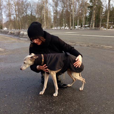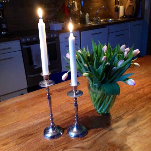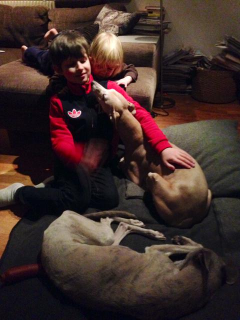 Morgonen kom till slut. Fredrik kom ned med nyvaken och väldigt hungrig Maria vid halv sju. Olle vaknade i soffan. Det blev Bollibompa och frukost. Detta är första morgonen på jag-vet-inte-när som Tuscan inte velat ut på natten för att kissa? Jag blev förbluffad. Han är trött och sover djupt. Olle pratar mycket om Tuscan. Att han ska till himlen idag. Han kramas. Är nära. Visar hur Tuscan tycker om att han gör, det vill säga, masserar hans panna och nacke. ”Det tycker han är skönt..” säger Olle mjukt. Maria vill ”kjama Olle!” och kryper nära honom. Vi har en fin stund – ett slags avsked från barnen tillsammans innan det är dags för avfärd mot dagis och skola. När Fredrik tar barnen ut genom dörren vinkar jag på farstutrappan. Olle pekar upp mot himlen. ”Mamma himlen är rosa, titta! Det är för att Tuscan kommer dit idag!” Jag blir alldeles varm. När de åkt, börjar jag fixa i ordning. Förberedelserna är klara, nu till verket. De vackra 50 stycken vita- och ljusrosa tulpanerna sätts i vaser, jag tänder en mängd ljus. Jag sätter på mig själv en fin tunika i kärleksröda färger, jag väljer pappas ring och armband. Jag gör allt som planerat. Jag hade tänkt att ha på klassisk musik på låg volym, men det kändes inte rätt. På Spotify valde jag istället ett ljudspår med fågelsång, som jag älskar – det är en ensam koltrast som sjunger. Det lät som om jag tjyvstartade våren inne. Tuscan som älskar solen, gärna om våren och sommaren.. Och det är min favoritsångfågel – och pappas också. Allt var fint i köket, vardagsrummet. Det kändes högtidligt. När Fredrik kom hem, tog han en kaffe. Trygg doft spred sig i köket. Sen gick vi på liten promenad med hundarna. Vi bar Tuscan påklädd med hans jacka ända ut på farstubron. Sen hände det igen. Han liksom fokuserar all kraft – på att gå framåt. Trots smärta i kroppen, trots vingligt och den ishala väderleken ute gör det inte lättare för någon – men Tuscan är en kämpe. Jag blir glad, Fredrik och jag imponeras. Vi gick över vägen till golfbanan. Där står han en stund stilla. Vi väntar in honom. Ska vi gå hem? Tuscan står stilla och tittar ut över golfbanan. Vädrar doften. Så vackert! Jag tänker, det var som ett avsked. ”Vad vi gått här i alla år..” SEN. Går Tuscan fram till en björk och kissar genom att lyfta på benet! Jag höll på att skrika av lycka! WOW! Tuscan, som har så ont i kroppen och ostadig i balansen på grund av smärta har suttit ner och kissat tidigare. Men idag, nu och här – lyfter han på benet. Vilket beröm, superkille, Tuscan! Sen kom nog smärtan, för han stod och liksom var stilla, kunde inte gå. Så jag bar honom. Vi gick tillbaka igen. Klockan är halv nio. Snart kommer veterinären. Snart är det dags. Känslorna bara rusar i min kropp. Älskade Tuscan! Tårar kommer. Ögonen är så ömma, ögonlocken bränner. Nu är det inte långt kvar.