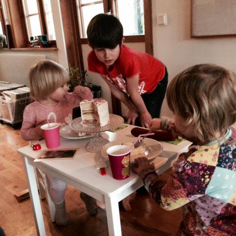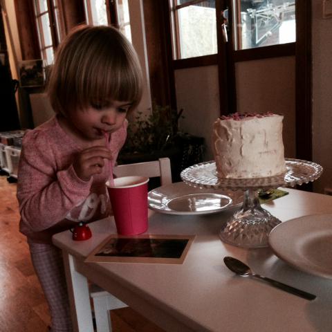 Idag för tre år sedan föddes vår älskade Maria! Redan för någon vecka sedan när vi började prata om ’kalaset’, sa Maria att hon ville att Jennifer, hennes bästa kompis på dagis, skulle komma! Så vi gjorde ett litet ”eget” kalas för de två på förmiddagen. Jag hade gjort en mindre tårta, men högre, med rosa sockerhjärtan på toppen – och dukat fint på det mindre barnbordet. Det var rosa-vita ballonger, och riktig kalasstämning. Olle var en sån fin storebror, han fyllde självmant (!) på tjejernas saftglas och hjälpte dom att dela tårtan. Jennifers mamma berömde Olle, så hjälpsam han var..! Världens bästa storebror, Olle!