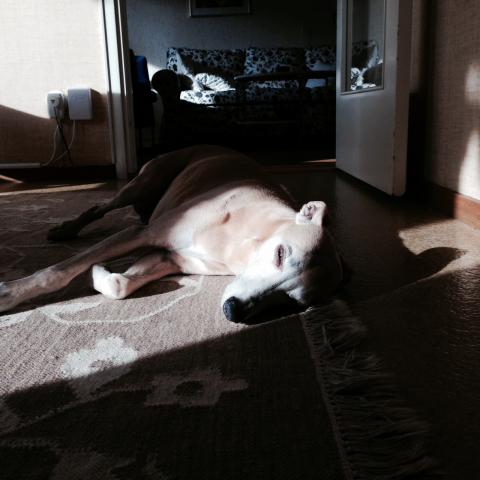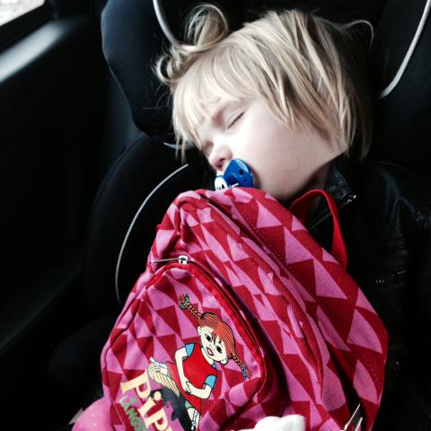 Stina kunde inte komma och gratta Maria igår, då pendeltåget fick ett stopp på vägen och blev stannandes där. Vi bestämde då att jag skulle komma förbi idag, söndag istället – med barnen och Aston. Maria hade med sin nya, fina ryggsäck – redan en favorit – som hon fick av mormor igår, och bägge barnen hade med varsina ballonger i bilen. Aston och jag hade gått långpromenad på morgonen där han sprungit lös på golfbanan. Å vilken fin söndag! Fredrik åkte till sina föräldrar i Västerås. Hos Stina klev vi in. Olle sa direkt när han kom in i köket, ”Ååå.. jag vill BO här mamma. Kan vi inte byta hus?” och vi åt pizza, lyssnade på underbar barnsång och Maria öppnade ett fint paket från Stina med fina rosa tröjor.. Barnen lekte i lekrummet, vilken lekskattkammare med alla roliga saker. Överallt var Aston med. När vi tog kaffe på maten och tog fram lite tårta från gårdagens kalas, hittade Aston solstrålar på köksgolvet. Olle och Stina var ute och spelade mini-golf, Olle gjorde tre hole-in-one! När vi avnjutit flera timmar tillsammans åkte vi hem. Maria somnade i bilen, och vi var alla nöjda med dagen..!