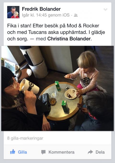 Igår hämtade vi hem Tuscans aska, som nu finns i vacker träurna. Alla frågar vad vi ska göra med den. Kanske gräva ned och plantera vackert träd eller buske, eller kanske sprida ut askan på någon favoritplats i skogen. Det kändes vemodigt och ändå lite högtidligt att hämta hem urnan. Vi tog en fika på stan efteråt, och Fredrik uppdaterade sin status på Facebook med detta inlägg ovan, fint skrivet tycker jag.