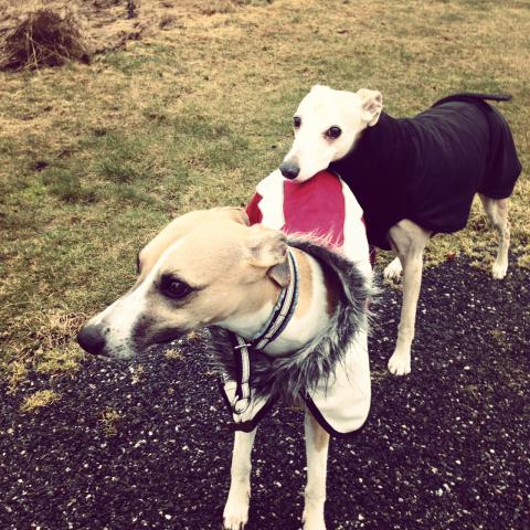 Efter veterinären hade vi stämt träff med en whippetägare som skulle ta med sin fina tik, Iza, som är 3 år gammal. Vi fann varandra på whippetforum på Facebook. Vi gick en lång runda på golfbanan. Aston blev helt kär! Men så hon yrde runt, sprang, busade och det var härligt att se. Aston var lite långsammare, men att tyckte uppstod, rådde det ingen tvekan om! Vi ska ses igen framöver! Så roligt!