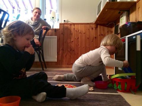 I förmiddags hälsade vi på hemma hos Jennifer – Marias bästa kompis på dagis. Första gången vi besökte henne hemma! Så fort de sågs börjde de skratta och leka, springa och skratta.. Vilket äventyr! Redan på morgonen ville Maria baka något till Jennifer, till Besöket. Så hon och jag gjorde chokladbollar, och det gillade flickorna till fikat. Plus bullar och kaffe också till mig och Jennifers föräldrar. Så kul det var att ses..!