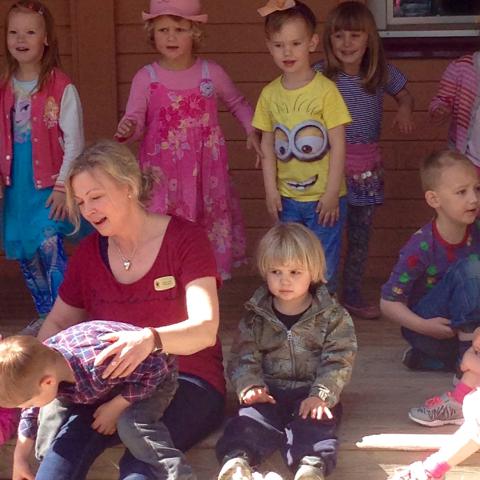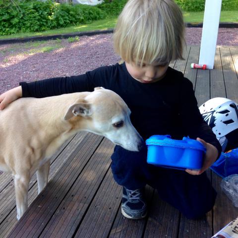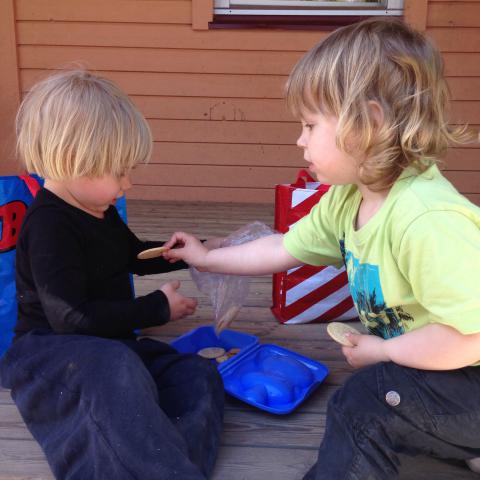 Härligt med försmak av lite sol och sommar, perfekt till förskolans Sommarfest idag på eftermiddagen. Föräldrarna var välkomna kl 15.00, med picknick. Det var ballonger i trädet på gården. Först sjöng och dansade Maria med alla dagiskompisar framme på altanen, scenen. Maria satt intill Jennifer. Sen var det picknick! I Bamseväskan jag hade med fanns lite gott. Hallondricka, Mariekex, minikex med djurmotiv och vaniljrån – och äpplen i skivor. Maria och Jennifer delade på varandras picknickmeny. De dansade, skrattade och höll igång. Vilken sommarfest! Hemma igen kunde Maria inte släppa taget om den blå lådan, hennes kaklåda. Aston fick också smaka några kaksmulor..