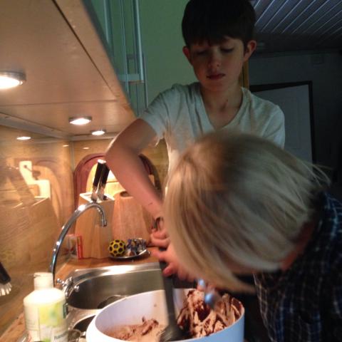 Igår morse efter frukost stängde jag ned tv, iPads och dvd. Efter någon förvirring gjorde vi andra saker! Kastade boll, skrev våra namn på rittavlan, sjöng, bakade kladdkaka. Fredrik hade sovmorgon. Olles kompis Gustav kom och hälsade på, killarna lekte med sina Bey blades. Det höll i sig hela dagen. Vi var ute och cyklade och Maria hjälpte att rädda en massa sniglar som gått vilse i trädgården. Imorse fortsatte vi med det analoga. Det är rätt mysigt att äta frukost i ’kojjan’!