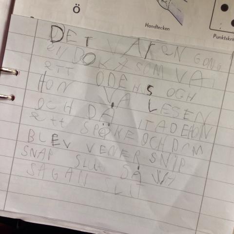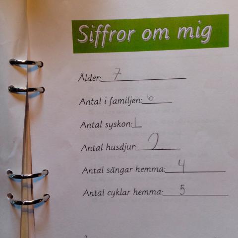 När Olles skolavslutning var över var hans ryggsäck tung på väg hem. Två pärmar med klara uppgifter, ritade bilder och handskrivna matteuppgifter från första klass följde med hem. När barnen sov en kväll började jag bläddra bland pärmar och papper. Å jag blev varm i hjärtat. Hans sida med ’Siffror om mig’ var så fin, med sammanräkningen över alla i familjen. Och så bläddrade jag fram till en saga som han skrivit, med fina bokstäver: