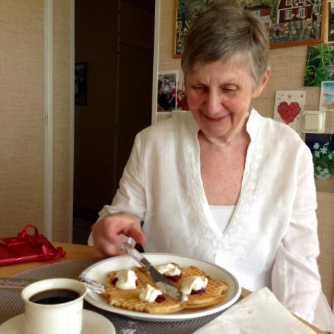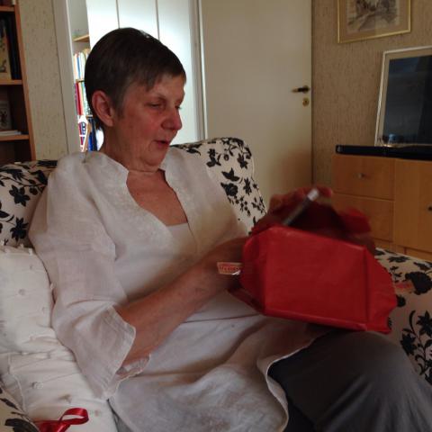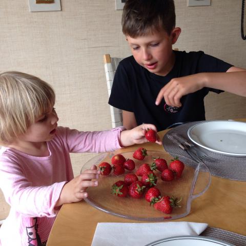 Så var det dags igen för litet besök hos Stina! Själva presenten som jag ville ge förra gången vi besökte henne var som bortblåst då. Nu var den funnen, vi bokade tid! Å så roligt! Stina bjöd på svenska jordgubbar och nygräddade våfflor! Och fick ’Paketet’! Äntligen! Sen lekte vi på innergården, spelade minigolf och hade skoj. Till sist åkte vi hem.. Tack för idag!