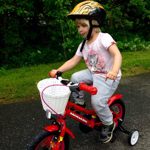 Äntligen – Maria har fått en egen 2-hjuling med stödhjul! Lyckan är total! Och gosedjuren får plats i lilla cykelkorgen vid styret..