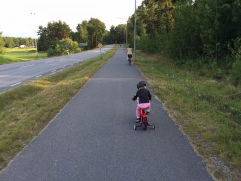Efter Skansenbesök och pastamiddag hemma ville vi gå ut. Dags för liten cykeltur. Maria ville cykla själv på sin egen cykel, och det blev premiär för fyra cyklar i vår familj på cykeltur. Maria har så fin känsla för balans och motorik. Kämpade fint i uppförsbackar, och började lära sig hur man gör när man bromsar.. Vi var så stolta som följde henne! Hemma tog Olle och Fredrik liten biltur. Jag och Maria fann smultron vid Fjällbjörken, sparkade boll och vattnade blommor. Nu är klockan nio och barnen är fortfarande ute och leker..!