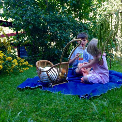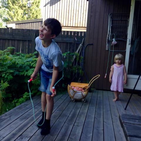 I förmiddags reste våra gäster hem och vi packade vår väska och åkte till mormor. Tjugo grader varmt ute – härligt! Vi har promenerat med vagn och Aston ner till Alby. Maria badade, mormor tog Aston och Olle för att köpa glass.. På vägen tillbaka såg vi ett rådjurskid, en ryttare som red barbacka på sin ponny – vilken dag! Vi var ute i tre timmar, härligt! Hemma är det kaffe och saft på altan och filt, lite busbrottning och skratt..!