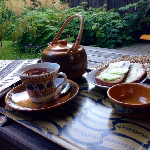 Jag blir så nostalgisk när jag ser bilden på din te-stund på altanen. Servicen,som heter Aleppo, i 9 delar, var bland de första vi köpte tillsammans pappa och jag. Den är inköpt på IKEA, 1962/63. Då bodde vi ännu i alteljélokalen i Hässelby strand. Den blev tyvärr inte så mycket använd, dels var vi rädda om den och pappa ”trodde” inte det var så god kvalitet på porslinet så att den höll för vardagsanvändning.