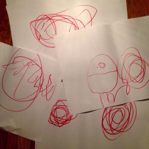 Nya regler med tidsramar för iPads för barnen ger mer tid till annat! Lek med bilar, spring med kull, bygga kojja, rita.. Bland annat!! Här är ett urval av Marias fina teckningar – ”Monstret mamma!” Säger Maria stolt och pekar på teckningen som sticker ut till höger på fotot. Den var hon särskilt nöjd med. Efter middagen tog vi minipromenad allihopa med Aston. ”På dagis har vi ficklampor”, berättar Maria. Det ska vi också köpa, bestämde vi. ”Jag vill åka kälke!” sa Maria och längtar till snön kommer..