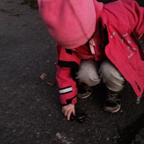 När jag hämtar Maria från dagis nu är fickorna fulla med guld. Kastanjer! Fina, blanka. Hon har till och med fått Olles gamla samling i lilla väskan. Nu fyller de upp tygpåse och lilla väskan. Guld värt!
