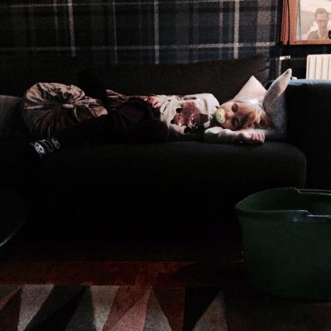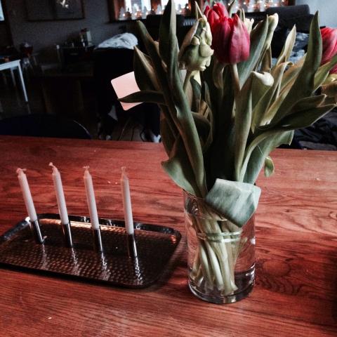 Maria sov hela natten. Jag vaknade av att Olle fick en behandling med lusschampo i badrummet av Fredrik. Igår såg de litet kryp i håret som ramlade i handfatet.. Nej. Inte det med.. På morgonen stapplade Maria själv ned från soffa till hinken och kräktes.. Själv börjar jag piggna till. Maria fick Resorb i små teskedar, och var trött men ändå på ett gott humör. Jag sa till henne att jag tror bacillerna har kommit ur ur kroppen. Att nu kommer det bara bli bättre. Förmiddagen har tvättmaskinen gått varm. All Olles textil är på tvätt. Sängkläder, byxor och tröjor, gympakläder, handdukar.. Och så nu. Ringde det på dörren. Blombud? De finaste tulpanerna från underbara mamma och mormor! Sån lycka mitt i magsjuka och löss denna fredag. Tack rara! Nu kommer det vända!