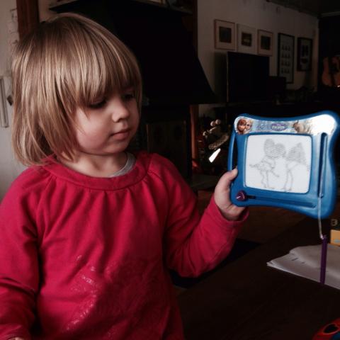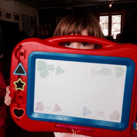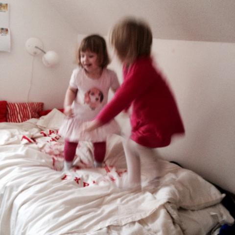 Lyckan blev total när det ringde på dörren. Maria hade dukat bordet, satt fram glas till henne och Jennifer, valt saft och lagt kaka på liten servett. Jennifer visste inte om hon skulle spela mini-biljard eller fika när hon kom, det spratt i hela kroppen! De fann ritborden, skrev siffror och ritade figurer. Sen upp och hoppa lite i Olles säng. – Det får man, förstår du, förklarar Maria..