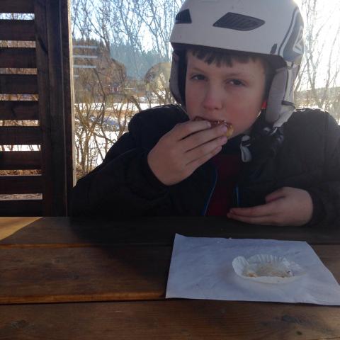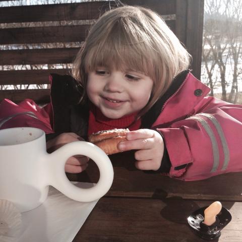 Idag skiner vintersol och efter lugn förmiddag inne tog vi oss ut med Aston på tur. Vi gick ett tag och tog en paus och öppnade ryggsäck med fika. Där fanns varm choklad och bullar. Aston fick också en bit!