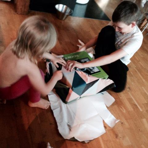 Idag är Olle 9 år. Fick sin högsta önskan uppfylld, spelkonsollen XBox One och bilspelet Forza. Och vi gjorde god kladdkaka – jag och barnen, som vi åt efter middagen. Vi sjöng två gånger för Olle. En gång imorse, och en gång på kvällen. Maria hjälpte Olle att öppna paketen. – Jag vill också! Vi fick fint stort vykort från farmor, och från kusinerna i Vänersborg. Olle läste stolt. Under middagen ringde telefonen. Farmor ringde och sjöng för Olle.. ”Röda små smultron, blommor och grönt..”