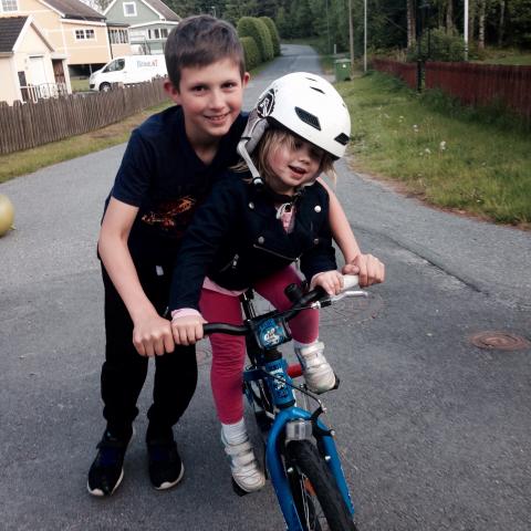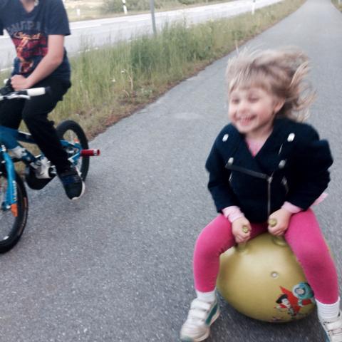 På kvällen tog vi cykel- och hundtur. Maria tog med hoppbollen, det gick bra det med! Mycket fniss och skratt..