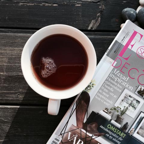 Solig morgonstund på lilla trappan med min frukost. Maria sover, Fredrik också. Bara jag och Olle vakna. Igår kväll fick Olle sin först mobil! Och det var min gamla iPhone5! Dubbel lycka, då jag fick köpa ny – så nu knappar jag på en fabriksdoftande iPhone6S. När jag ska avnjuta min frukost ser jag ett fint hjärta i teet av bubblorna!