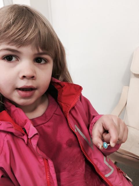 Idag klockan åtta var jag med Maria hos tandhygienisten för 5-årskoll. Det var så spännande. Maria var lugn. Vad skulle hända? Jo, väl i tandläkarstolen fick hon gapa och visa tänderna. Lampan sken rakt i ansiktet. Tandhygienisten tittade i munnen. Kände. Pratade lite. Lite mer tandborstning längst bak i munnen, det skulle mamma och pappa göra! Annars såg allt så fint ut! Maria valde ljusrosa tandborste och en jättefin guldring! Allt gick så bra. Nu mot dagis.